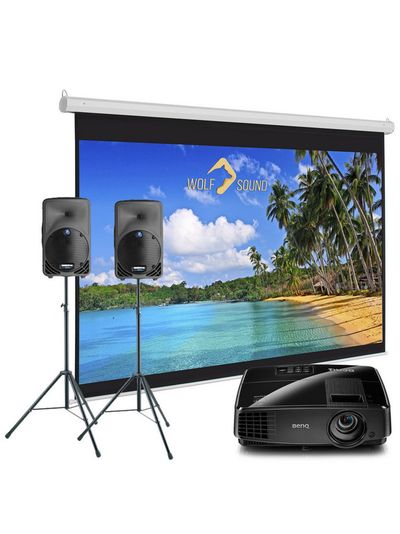 - Комплект состоит из: двух активных колонок со стойками, микрофона со стойкой, проектора, проекционного экрана (радиомикрофон, ноутбук по запросу).